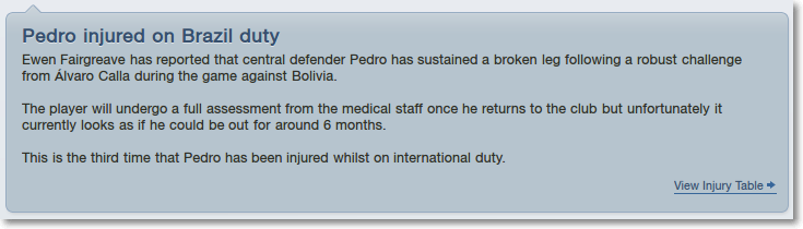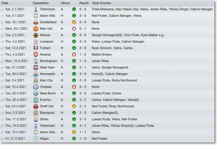 So with Scarborough sitting 4th and my new signings ready to go I felt optimistic going into January. We started in style thrashing Spurs 6-0 at White Hart Lane and then continued with victory over Aston Villa. The next four games were mixed seeing two victories, one draw and one loss. The mixed form continued with two wins and one loss from our next three games, but then what felt like disaster struck as my key centre back Pedro broke his leg and would miss 6 months. This awful injury didn’t seem to effect us too much though as my boys went onto win 9, draw 2 and lost one of our next 12 matches.