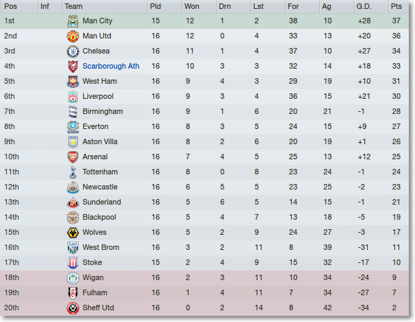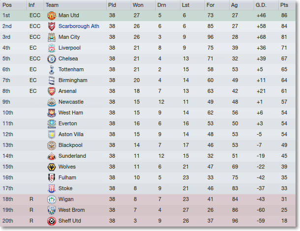 After such a successful first season I set myself the goal of 4th place…while that may have seemed like a stretch looking at the quality in England, I felt like the summers additions would give us the edge that was lacked last season. And I was proven right by our early form as Scarborough won the opening three games including a 3-1 victory over Man Utd. Then despite a loss to West Ham we carried on winning against Wigan and Birmingham before things got tough. A difficult fixture list and bad luck with injuries saw my boys draw the next two against Arsenal and Newcastle before losing to both Manchester City and Chelsea. With a tough run out the way we regained composure though and went onto win 5 and draw one of our next 6 matches.