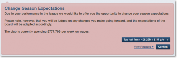 I actually forgot to get a screenshot of the boards expectations and media odds. But the clubs owners demanded a top half finish which led to a transfer budget of £26 million and extra £260K a week in wages.