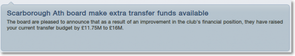 Stepping back a little to November I had some very good news, my board showed their support and enthusiasm by coughing up £12.25 million. This helped raise the bank balance significantly.