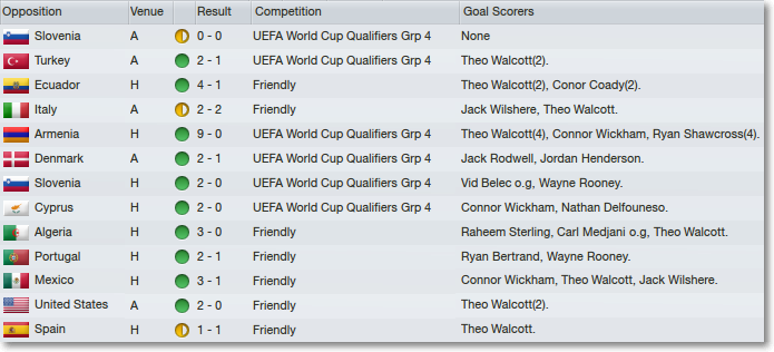 After an away draw to Slovenia it was all go for England. We walked through the remaining World Cup Qualifiers and then onto our Friendly matches. I personally arranged all the matches after our final WCQ against Cyprus. I wanted to gradually build the team up towards the mammoth task ahead. I think all the Friendlies served there purpose as we proved more than capable against easy, average and exceptional opponents.