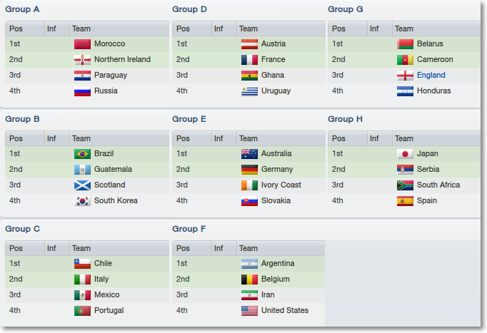 OK we’re almost there guys, just stay with me a little longer as we still have to cover England. This is the World Cup year of course, so please go to the next page to see our warm up to the greatest show on earth and what happened in the tournament itself…