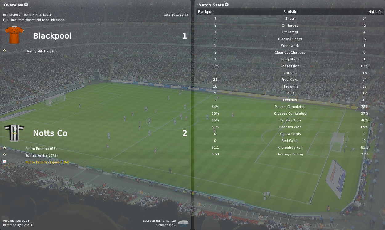Next up, the second leg of the Johnstone’s Paint Trophy North final. The first leg was played at Meadow Lane and despite dominating the whole game we were not able to gain more than a 0-0 draw last month, now we had to stand firm and win the tie away from home. Blackpool were lucky to score am early counter attack goal and despite having quite a few chances in the first half we couldn’t get it past their keeper, he pulled off some spectacular saves. We did it after the break though, first left winger Pedro Botelho headed in a far post cross from right back Gergely Varga and then Tomas Pekhart placed it in after a great run and assist from Romain Gasmi. We were through to the final but there were bad news after the game, Pedro Botelho had a few broken ribs and he was going to be out for around 7 weeks!