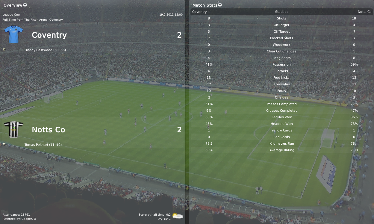 We had another tough league game coming up, away at 4th placed Coventry. We won the home game 5-0 back in October but I wasn’t expecting an easy game. Pekhart wanted to prove me wrong and buried it twice in the first half, he was unstoppable. Coventry looked better in the second half, more offensive, but we ruined everything in only three minutes! It was a shock and my team was not able to react after that, Coventry were more aggresiive and even had the chance to win the game.