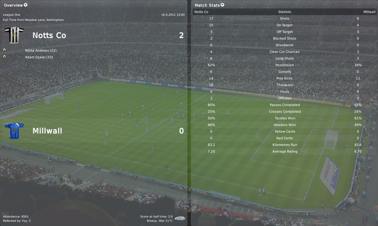The next game was at home with 12th placed Millwall, a team that we defeated quite heavily in December, 4-1. Andreev and Szalai scored in the first half to finish off two nice team moves. We played very well in the second half too but we missed the chances and almost got punished by Millwall on counter attacks.