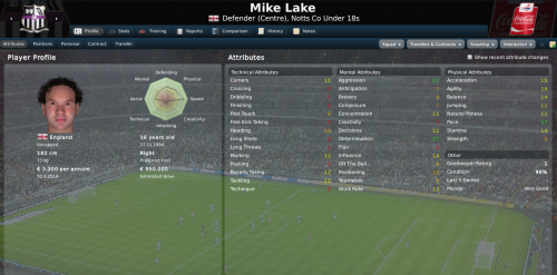 Last but not least, there’s an exciting prospect in this year’s youth intake! He’s a centre back and his name is Mike Lake. I already offered him a professional contract because Arsenal and Aston Villa are trying to buy him, they made offers from 500K to 1 million for him!