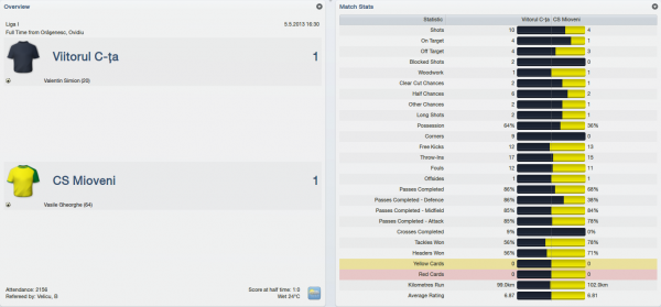 The game was fairly quiet after the break, nothing important was happening and we seemed to keep things under control with ease. Well, that was true until the 64th minute when Mioveni caught us on an unlikely counter attack and scored with their one and only shot on target… My team reacted, we pushed them against the ropes but unfortunately we missed a very good chance 20 minutes from time and that was that, we had thrown away two very important points.