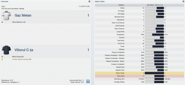 We started to look a bit better after the break but the match was heading towards a goalless draw. Well, that draw would have been good… Pandurii broke the deadlock 18 minutes from time by taking advantage of some dismal marking from my lads on a free kick and then bagged two sensational goals to wrap things up (you really have to watch those goals!). Midfielder Corado Carstoiu then scored a consolation goal for us but it still was a painful defeat against a direct relegation rival.