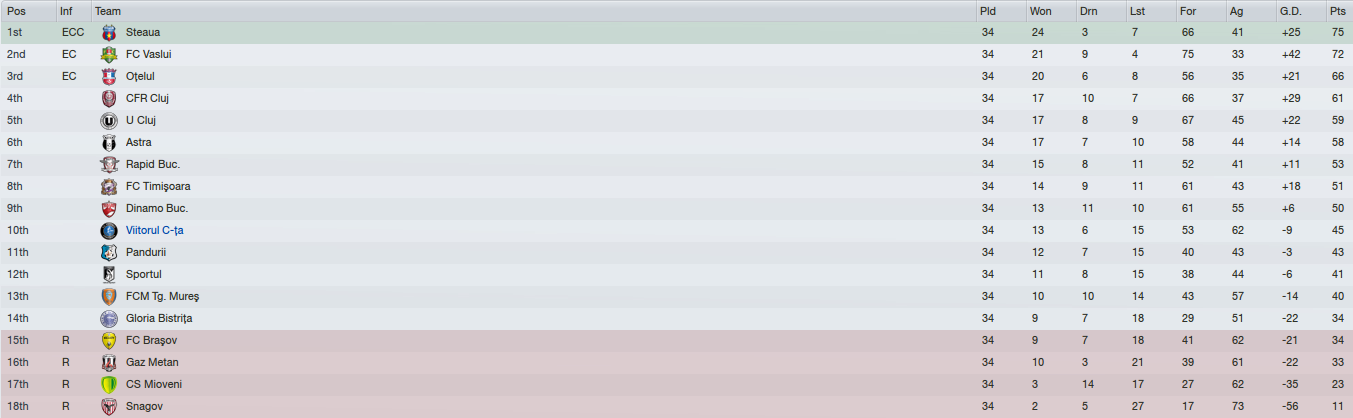 Here we go folks, it’s time to find out whether my Viitorul Constanta managed to survive in the Romanian First League or not… Welcome back to my Football Manager 2012 story for the decisive episode of my second season in charge, the final two months of the 2012-2013 season. As you know we were 11th at the end of March with a thin 5-point cushion over the relegation zone (the bottom four teams get relegated). Let’s see how the survival battle went…