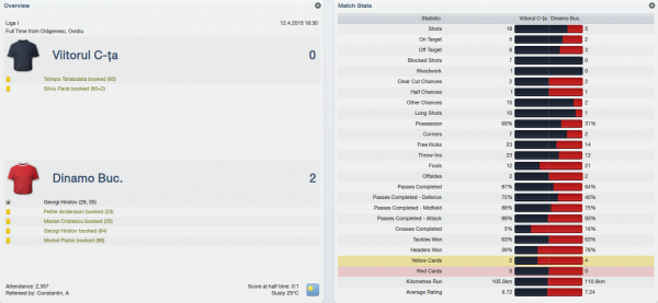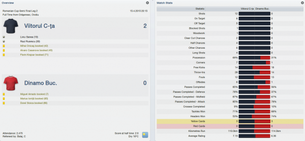 Sadly the second half didn’t start much better for us as Dinamo took advantage of some rather poor defending on our part and made it 2-0 after just three minutes. There was no reaction from my team and the home side could have scored again on 62 minutes. We were playing quite badly and at that point I was just hoping to keep that result and possibly make things right in the second leg. Things got a lot better when I least expected it though, new signing Silviu Pana unleashed a fierce drive from 30 yards to score his first ever goal for the club which reduced the arrears and boosted our hopes for the second leg.