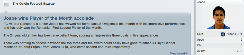 Joabe was deservedly elected Player of the Month, he finally seemed to show the kind of performances I was hoping he would. I received an award myself, Manager of the Month, but that’s not too important.