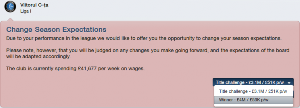 As you might remember our financial situation was pretty good thanks to all that Champions League money but I wasn’t expecting any extra transfer funds from my board. Well, they prepared a nice surprise for me before the end of January, they proposed a change of season expectations and I immediately took the chance: I promised them the title for a hefty 4 million pounds in transfer money!