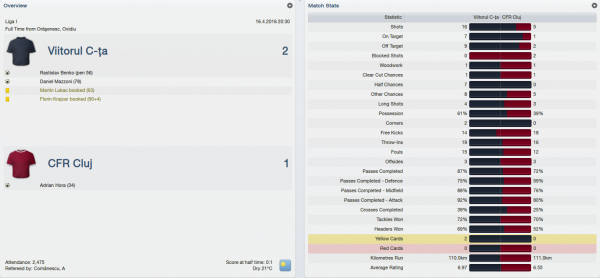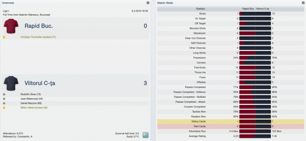 The month ended with a sensational Romanian Cup performance against FC Timisoara, we won the first leg of the semi final 4-1 but we could easily have scored a lot more. The winning streak continued in the league mostly thanks to Rodolfo Oliver who returned from injury with an insatiable appetite for goal, we won three games in a row and he was the only one to score in those games. Then we booked our passage to the Romanian Cup Final with a quiet 2-1 second leg win against FC Timisoara.