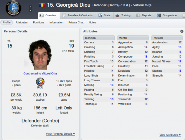 You might remember that I mentioned a young Romanian centre back that I wanted to buy, I had spotted him in the Romanian national Under 19 team last season and tried to buy him ever since. After some negotiations with his club, Universitatea Cluj, we agreed on a price tag of 3.5 million pounds and the youngster joined Viitorul Constanta! Check out his profile, he’s pretty damn good for a 19-year old!