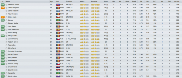 I am pleased to report that two very young players, Rastislav Benko and Danut Gongolea are leading the average ratings table in our squad but I think that players like Manoel or Daniel Mazzoni can step up in the second half of the season because I will do my best to give them more playing time. In fact, I am thinking about selling the older strikers like Ganea or Rusescu to make room for the youngsters.
