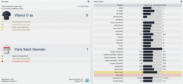 This time PSG had Pastore and Kevin Gameiro upfront while I was happy to welcome back into the line up a few players that had returned to full fitness like Anton, Motha and Oliver. The game started well, we were the team in charge, and we came close after seven minutes when Paul Anton was denied by a superb save from Salvatore Sirigu. Unfortunately PSG launched an immediate and swift counter attack and they converted it into a goal… My boys were not giving up though and we created another chance on 16 minutes but Rastislav Benko ended a good move with a dismal shot. Then PSG managed to keep things a bit under control but we still could have nailed the equaliser during stoppage time when Benko was denied by another huge save from Sirigu.