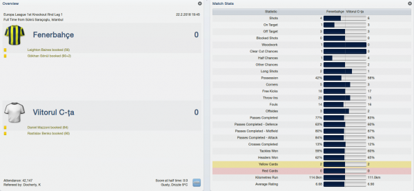 Fenerbahce had a new star in their team compared to that season, it was Leighton Baines himself! As for us, we had to do without Manoel who had picked up an injury during the winter friendlies. The game was totally boring until the 27th minute when the home side managed to carve out a huge chance, luckily the finish hit the post instead of the net. Then we took control of things, we kept possession pretty well but never really looked capable of causing any trouble in the final third. It was an ugly match but the result was pretty good for us.