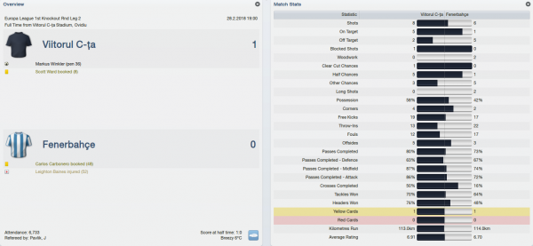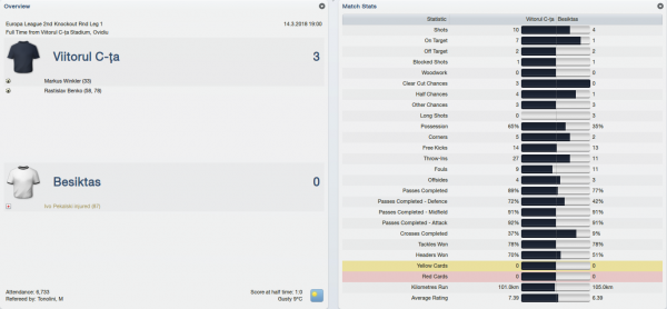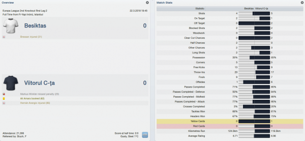 I was hoping to have Manoel back in shape for this match but unfortunately he had suffered yet another injury in a domestic match so I had to do without him for almost two months. As for Besiktas, they had quite a few well-known players like Reto Ziegler, Alan Hutton or Ritchie De Laet. We got off to a nice start this time and we could have broken the deadlock on 19 minutes when Daniel Mazzoni had a good header on target but his effort was saved. We continued to put pressure on our opponents and the reward finally came on 33 minutes when my lads decided to take an unusual corner kick which brought the ball inside the penalty area to Markus Winkler who found the back of the net with a low shot.