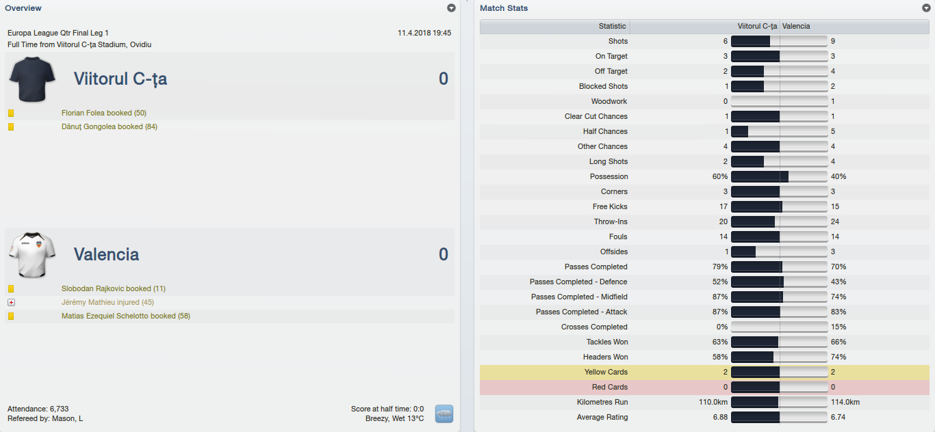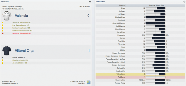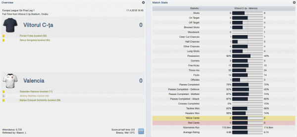I have to say that my hopes were rather down before the game and that is because we had many, many absences: Ali Amara suspended plus Scott Ward, Manoel, Daniel Mazzoni and Hernan Arangio injured! With that terrible injury crisis in attack (Mazzoni out for 3 months!) I had to add another striker to my ranks and I decided to recall Folea from loan and send him straight into the starting eleven… As for Valencia, they had knocked out strong teams like Schalke and Aston Villa and they had a good pair of wingers to rely on: Pablo Piatti on the left side and Matias Ezequiel Schelotto on the right.