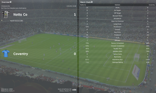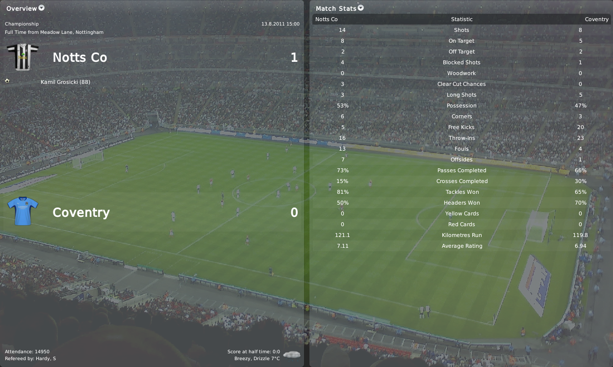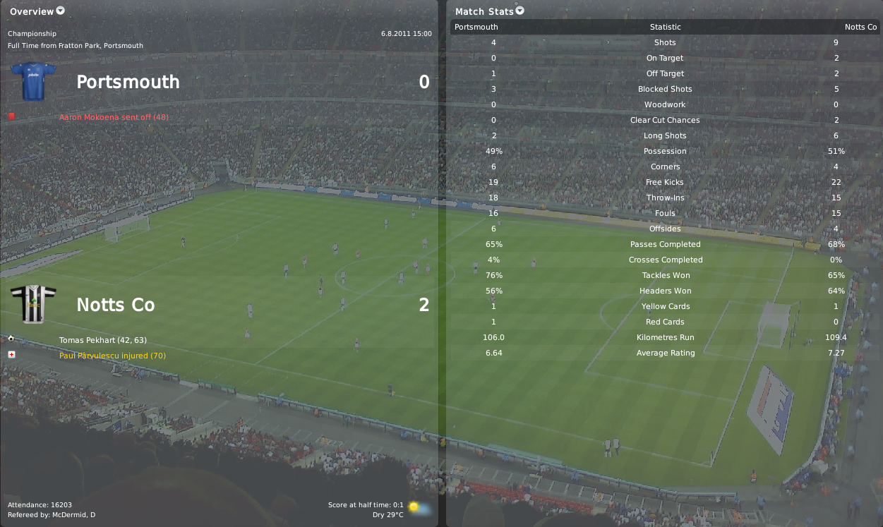 But I guess that’s just enough about Uruguay, there will be a special post about the national team that will be published after the Notts County December update. Now let’s get back to my Magpies, we were ready to make our debut it Coca-Cola Championship and we had quite a difficult game right away. The first game of the season was away at Portsmouth, a team that just got relegated from the Premier League. They were strong promotion contenders, so I was quite sure that we had to produce a good display in order to get anything out of that match. The first half was fairly even but Tomas Pekhart made the difference after a quick counter attack, we were looking good. The second half began with a brutal foul from Mokoena, he deserved two red cards for that one! We took control of the game thanks to the one man advantage and Tomas Pekhart struck again to give us a very important debut win.