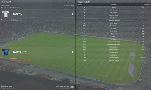 The next game was not going to be as easy, we were playing away at 3rd placed Derby County. We had a hard fought game with them in the Carling Cup in September, we won that one 3-2. This time we were playing for points, so I would have been quite happy with a draw. My lads started the game with great determination, we had no less than 4 corner kicks in the first 10 minutes! Despite our domination it was Derby who scored, they finished off a fast counter attack and took the lead. We continued to play pretty well and Tinga finally brought us back on level terms with a powerful shot from inside the penalty area. We could have won the game with a bit more precision upfront and maybe a bit more luck but I was satisfied with the team’s performance.