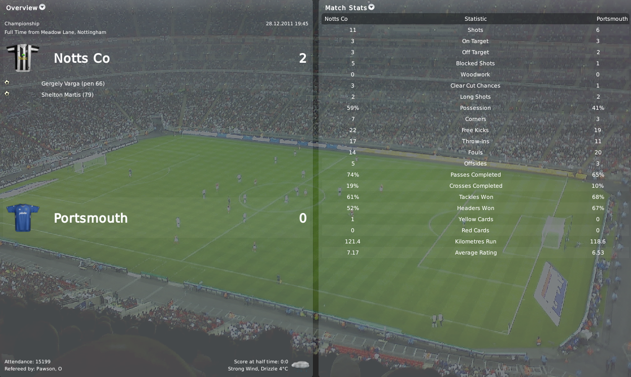 The last Championship game of the year was at home with 5th placed Portsmouth, strong promotion contenders. We beat them 2-0 away from home in August, so I surely hoped to repeat that result at home. We were pretty lame in the first half, we couldn’t get any shots on target at all! Things had to change in the second half and they did, Varga converted a penalty kick with great calm and then Shelton Martis finally scored his first goal of the season with a nice corner kick header. After the game A.C. Milan‘s manager, Leonardo, expressed his interest in my young right back, Gergely Varga. Not for sale mate, not for sale! :) He has a contract with us until 2016 and the lad is still very happy to stay.