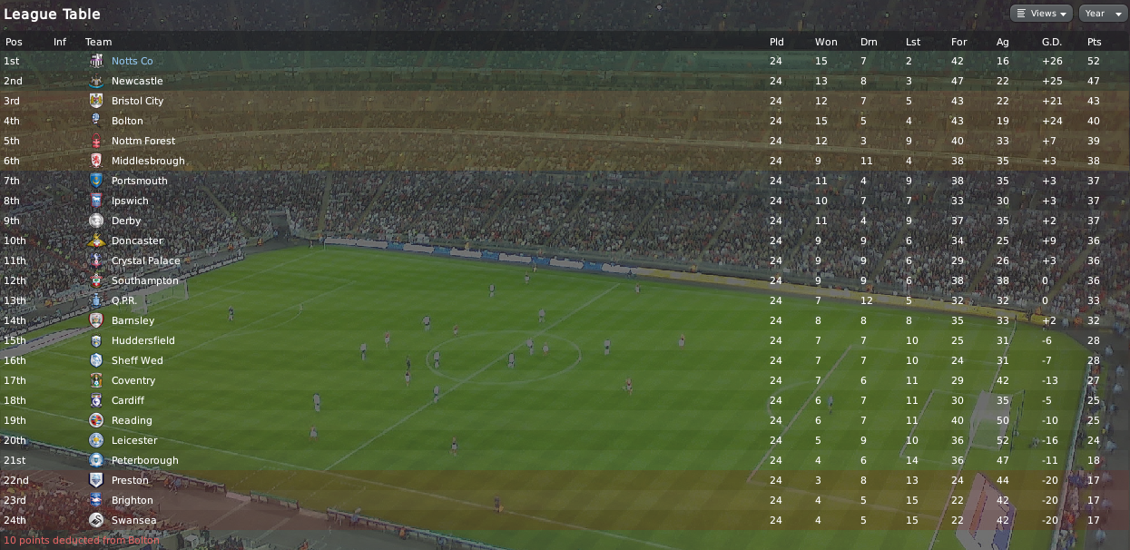 Top of the table at the end of 2011, I have to admit that’s quite pleasing. The battle isn’t over yet though, we still have to earn many points to gain promotion. As you can see Bolton were deducted 10 points, I think that was due to some financial problems. With those 10 points they would have been only two points behind us!