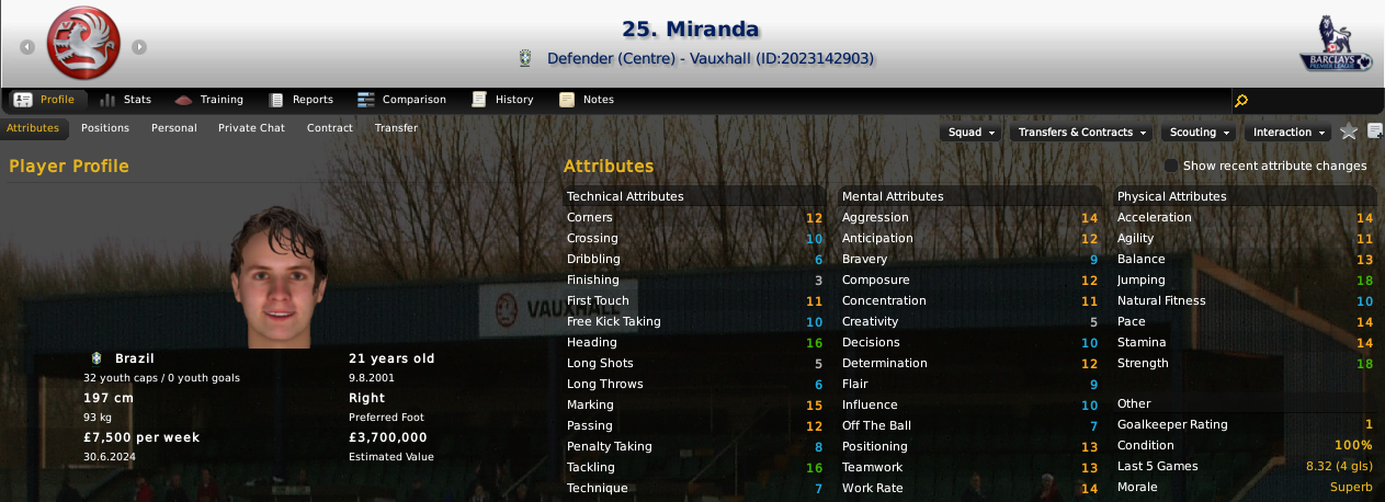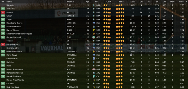 The player stats screen at the halfway point of the season sees young centre back Miranda leading the average ratings charts but that is because he has only played in six games. However, he has scored four goals and played pretty well throughout. I decided to promote him from the reserves team (click here to view his profile) after selling Javier Godoy for no less than 18.25 million pounds to Man United! Miranda is not as good as Godoy yet but I think he will get there pretty soon if he keeps playing like this.