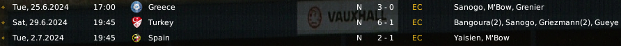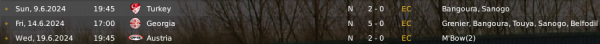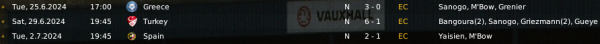 And now, the surprise! In October 2023 the French FA offered me a job as manager of their national team and I accepted mainly because that meant that I had a shot at the European Championship in the summer of 2024. And it was a pretty good shot considering the strength of the French team. However, I made a few modifications in the squad and the most important one was that I called up… Ibrahima MBow, the lad had just one cap for the nation and no goals! The group stage was as easy as it gets, we won all three games, scored 9 and kept a clean sheet. MBow scored his first goals for France in the last game, it’s funny how he always manages to perform well under my guidance.