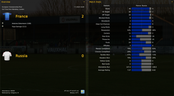 The final was expected to be a lot easier as we were going to meet Russia, a team that we had beaten quite comfortably in my first friendly game with France. The game was easy indeed, it was a major onslaught, but Russia somehow managed to survive and push the game into extra time. They finally cracked after 108 minutes of digging trenches in their penalty area, we definitely deserved to win this final and it really couldn’t have gone any other way. (click here to watch the highlights)