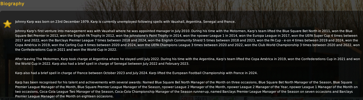 So, I added the European Championship to my international tally after lifting the World Cup, Copa America and Confederations Cup with Argentina. Here is my profile after resigning from the France job, as you can see I am not friends with the media :) That is quite strange considering that I am a journalist in my day-to-day life :)
